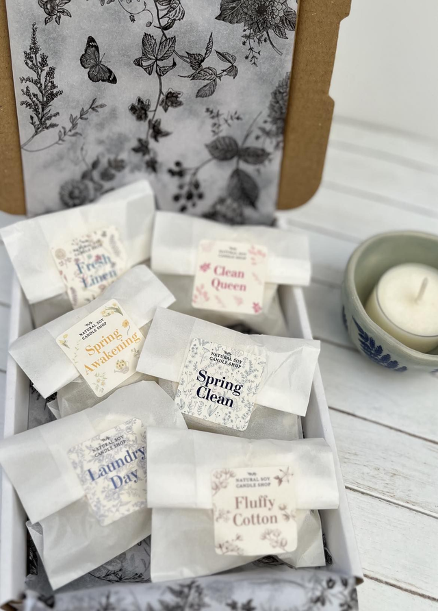 Six long lasting, clean burning Laundry inspired tealights are individually wrapped in glassine bags and wrapped in tissue paper each have a burn time of between 5-6 hours per tealight, making a beautiful home fragrance gift.